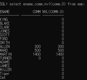 NVL( ) 함수 : NULL 값을 만나면 다른 값으로 치환해서 출력하는 함수
