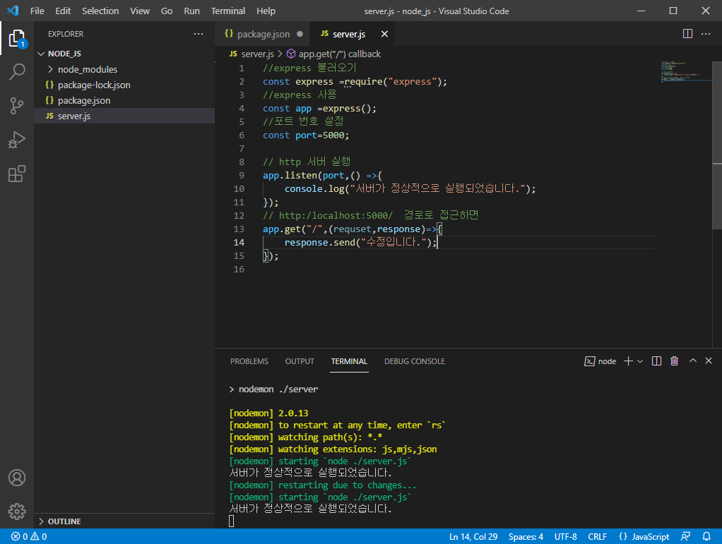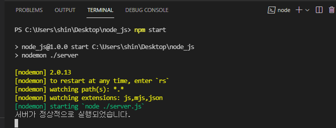 [nodemon] 이런 식으로 서버가 실행되었다면 성공입니다.
