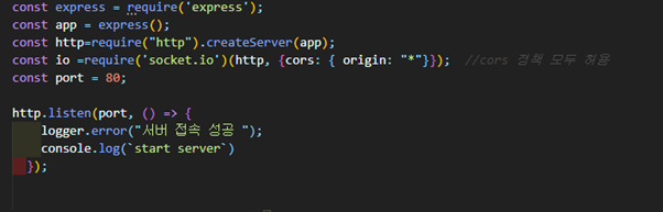 “const io = require(‘socket.io’)(http, {cors: { origin:”*”}}); “//웹 소켓을 사용하는 코드입니다.